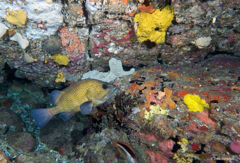 Acanthistius ocellatus kan een totale lengte bereiken van zo’n 45 centimeter. Het lichaam is donker geel/bruin van kleur met daarop allemaal kleine zwarte stippen. De vinnen zijn donkerbruin met een klein lichtblauw randje. Tijdens de nacht verstoppen ze zich in diepe kieren en spleten van het rif. Op een van de foto’s zie je er een ondersteboven tussen het rif hangen.