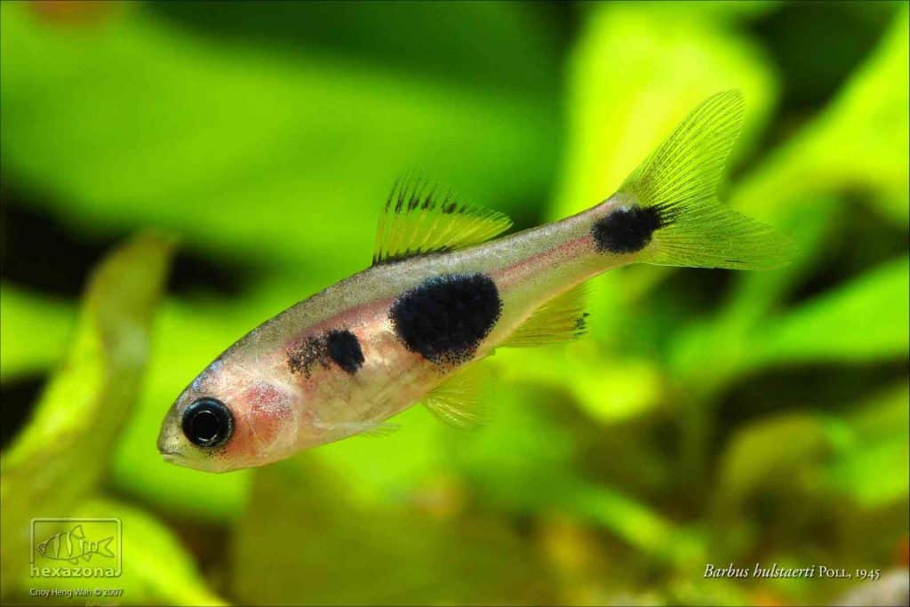 De Enteromius hulstaerti is een scholenvis van zo’n 4 centimeter lengte. Met de grote zwarte stippen op zijn lijf is hij een opvallende verschijning in het aquarium. Het geslacht van deze vis is duidelijk te zien aan de vinnen. Bij het vrouwtje zijn ze kleurloos, terwijl ze bij het mannetje overwegend geel zijn met smalle zwarte strepen aan de boven en onderkant.