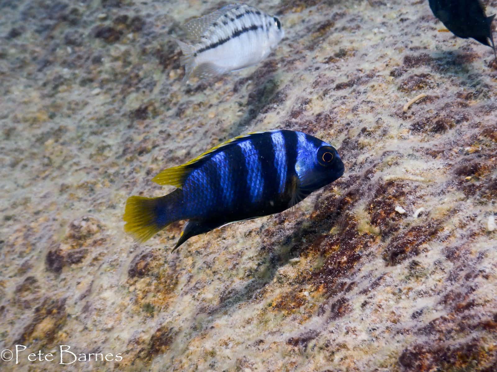 Volwassen mannen kleuren blauw met donkerblauwe tot zwarte verticale strepen. Vier daarvan zijn zeer duidelijk zichtbaar. De rug- en staartvinnen zijn afgezet met een gele rand. Op de anaalvin heeft de man een aantal eivlekken.