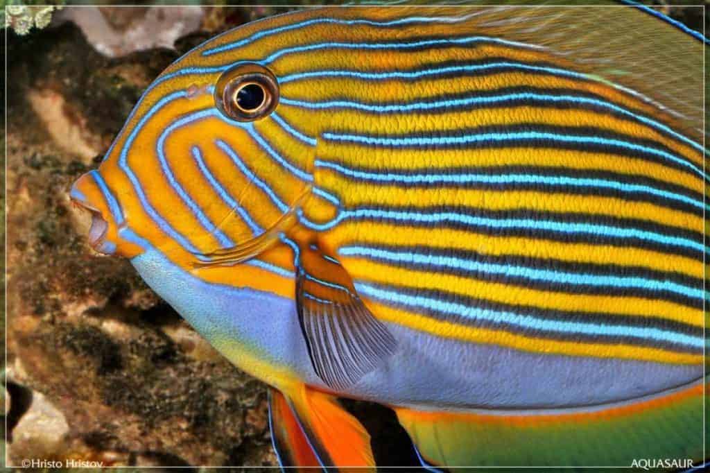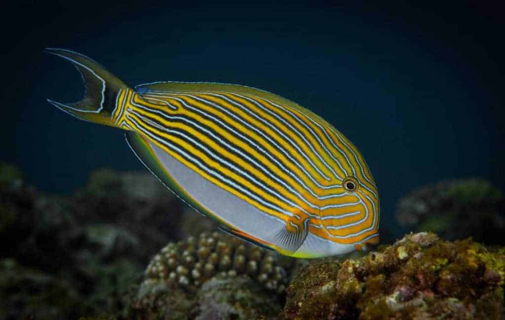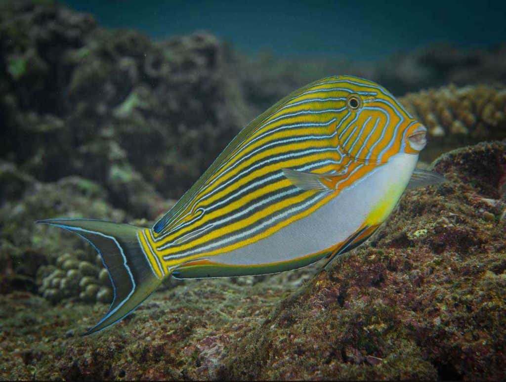 The genus name Acanthurus is derived from the Greek “akantha” (thorn) and “oura” (tail), referring to the sharp thorn on either side of the tail. The species name lineatus means “striped” in Latin, referring to the yellow and blue stripes on the fish’s body.