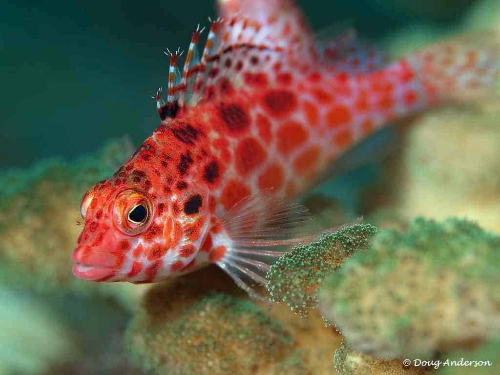 The Coral Hawkfish has an oval, moderately compressed body with a pointed snout and a straight profile. The head and flanks are variably colored from whitish to pink with reddish-brown to grayish or bright red-orange spots. There is a row of smaller spots along the lateral line and large spots on the spiny dorsal fin, including spots along the base of the fin. The soft dorsal fin and the caudal fin are also spotted. This fish species can reach a maximum length of 10 centimeters.