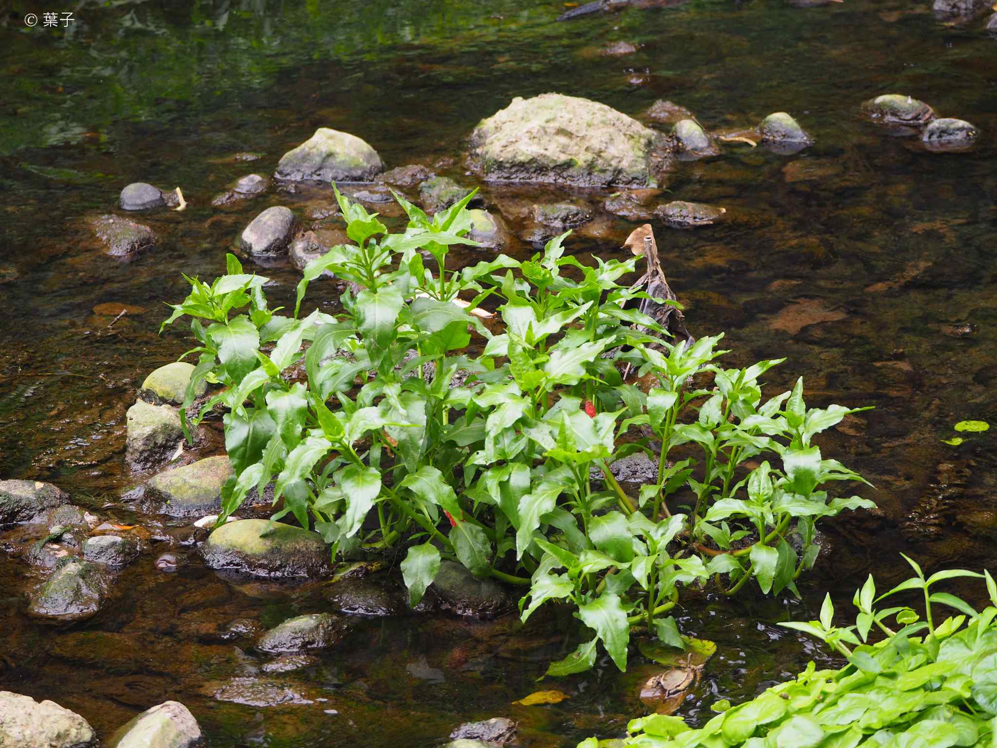 Gymnocoronis spilanthoides is a large, leafy stem plant with oblong, ovate to lanceolate leaves (4-20 cm long and 1.5-8 cm wide) with serrate margins. The leaves are dark green and glossy, with no specific patterns or markings. The plant can grow up to about 90 centimeters tall and wide in the garden, but in an aquarium the height will depend on the water column.