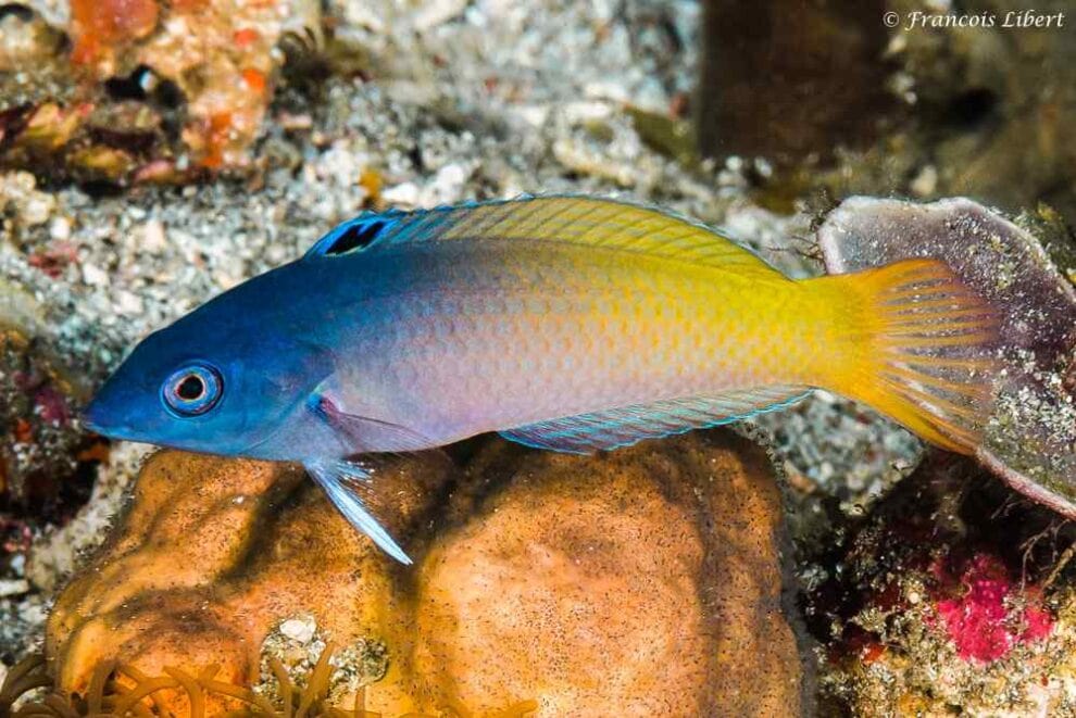 Halichoeres prosopeion was first described by Bleeker in 1853. The genus name can be broken down into two ancient Greek words. Halios means ‘sea’ and choiros means ‘pig’. Freely translated Sea pig. A reference to the elongated conical teeth that point outward and forward at the corner of the mouth. These teeth protrude beyond the lips of the fish. These canines reminded Rüppel of the teeth of a bore (male pig). The species name prosopeion means ‘mask’. This is not explained in the description but probably a reference to the colored head. Their common name is Twotone Wrasse.