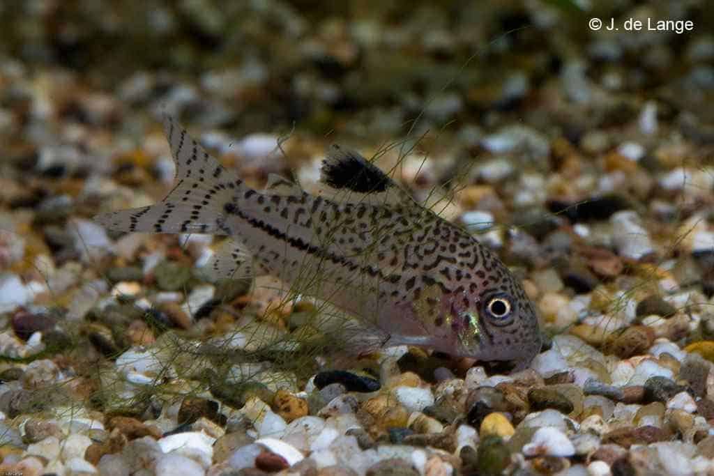 Hoplisoma julii, commonly known as the Leopard Hoplisoma, reaches a size of about 4 to 5 cm. This species features a silver-gray body with black dots and a horizontal band along its flank. Its dorsal fin is distinguished by a prominent black tuft. While females are generally larger and have a fuller belly than males, distinguishing between the genders can be quite challenging.