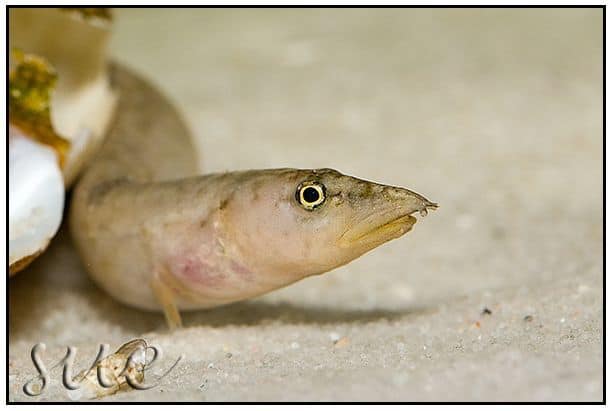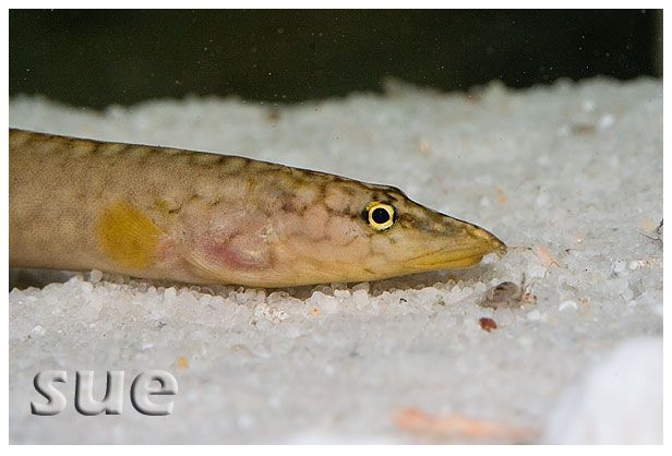 This spiny eel lays its eggs in a hole or tight space on the glass where other fish cannot reach them.
