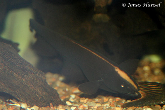 Il colore della testa e dei fianchi è generalmente grigio scuro o nero, il che aiuta a mimetizzarlo nel suo habitat naturale. Sulla parte superiore della testa è spesso presente una caratteristica striscia bianca o chiara che si estende fino alla base della pinna caudale. Questa marcatura è una caratteristica distintiva della specie e ne facilita l’identificazione. Le pinne sono generalmente di colore scuro, con una leggera traslucenza. Una o due bande bianche attraversano l’estremità della pinna caudale, che si assottiglia in modo rotondo.
